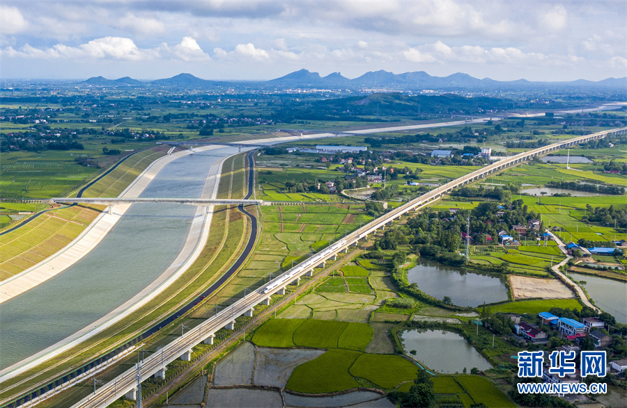 6月28日,安徽省合肥市廬江縣柯坦鎮境內的引江濟淮工程雄姿展現,河道、高鐵、公路在綠野中交匯,景美如畫。